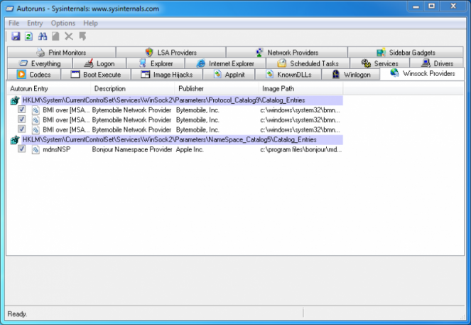 4. Launch Autoruns and then click the Winsock Providers tab.