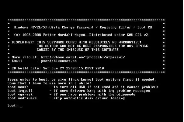Offline NT Password allows you to login into Windows if your user account is locked or disabled. It is free software and a fast password cracking tool. You do not need to access Windows or know the old password to use this software. The ISO image of this program is small. Reset any version of Windows using this software.