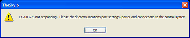 LX200 GPS not responding. Please check communications port settings, power and connections to the control system.