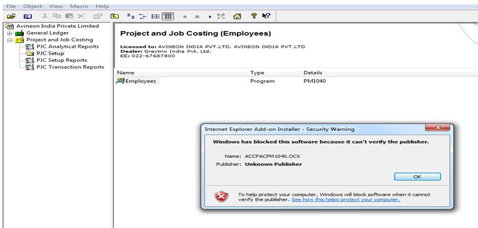 I have this error when I want to open Employee screen of Project and Job Costing in Sage 300 ERP. I don’t think that this error could be cause by the Add-On for Internet Explorer because I don’t remember to install any. Does anyone have a solution for this error ? What should I do ?