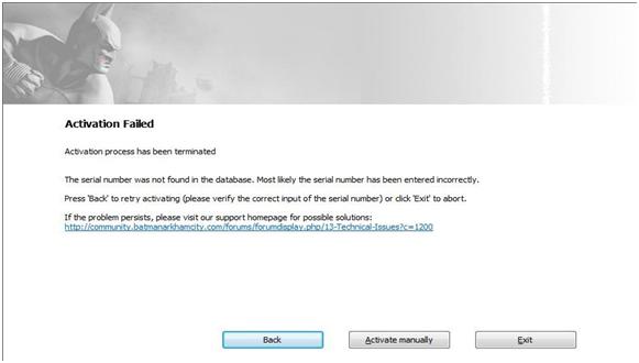 Press 'Back' to retry activating (please verify the correct input of the serial number) or click 'Exit' to abort.
