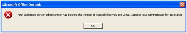 Your Exchange Server administrator has blocked the version of Outlook that you are using. Contact your administrator for assistance.