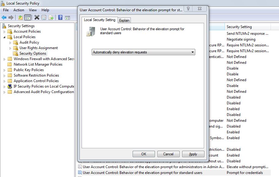 8. Select 'Automatically deny elevation request'. Then apply-OK.