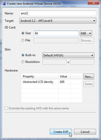 I would like to know is there any standard configuration for this virtual device like SD card memory, screen size, android version etc. My current config is SD card size- 512. android 2.1 update-1, default screen- WVGA800.