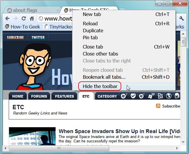I cannot find an option to auto hide the tool bar on my Google Chrome. I'd like to be able to use this browser without seeing a lot of icons at the top of my screen. Is this possible?