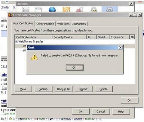Failed to create the PKCS #12 backup file for unknown reasons.