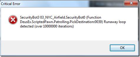 SecurityBot3 03_NYC_Airfield.SecurityBot0 (Function DeusEx.ScriptedPawn.Patrolling.PickDestination.0039) Runaway loop detected (over 10000000 iterations)