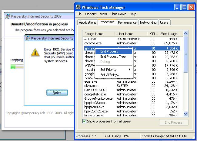 I am getting an error 1921 when using Kaspersky Internet Security on my computer.