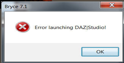 I am runningBryce Pro 7.1 on Windows 7 Operating System and trying to send a file to DAZ Studio but I receive the following error using the Bryce-DAZ Studio Bridge. After a few seconds this error shows up. Can anyone help me to fix this annoying issue? I would be grateful to you. Thanks for any assistance.