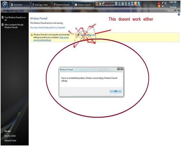 Due to unidentified problem, Windows cannot display Windows Firewall settings.