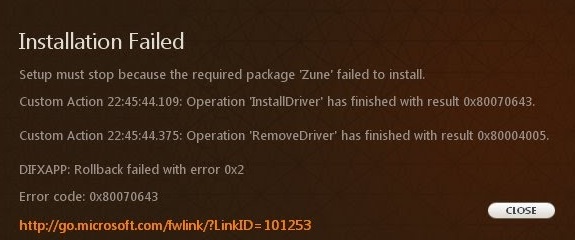 Hi guys,when I try to install Zune (Music and Video Software) it gives me this error code “