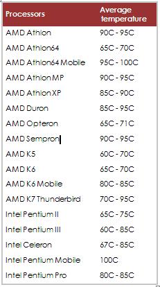 Well about the processor temperature I m sending you a list of famous processors average recommended temperature as you have not mentioned your processor make.