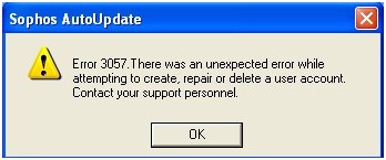 About a week ago I've tried installing the Sophos Antivirus Software, recommended by a friend. The problem is I'm failing to do that. Every time I try an error appears on the screen: "Sophos AutoUpdate Error 3057. There was an unexpected error while attempting to create, repair or delete a user account. Contact your support personnel."