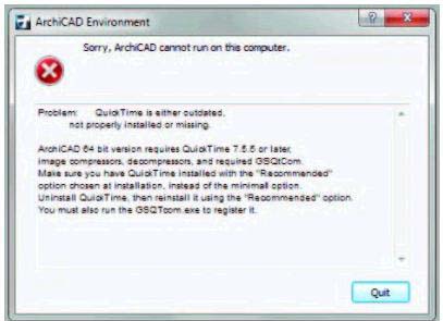 I am constantly receiving an error message when starting my ArchiCAD 12 with Windows 7. It says “ArchiCAD cannot run on this computer.” The problem might be QuickTime is outdated. But I have the latest version installed already. Can anyone enlighten me and share your thoughts about my dilemma? Thank you.
