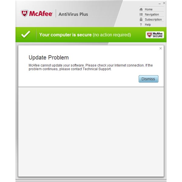 McAfee cannot update your software. Please check your Internet connection. If the problem continues, please contact Technical Support.