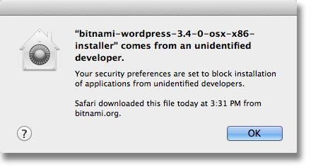 “bitnami-wordpress-3.4-0-osx-x86-installer” comes from an unidentified developer.